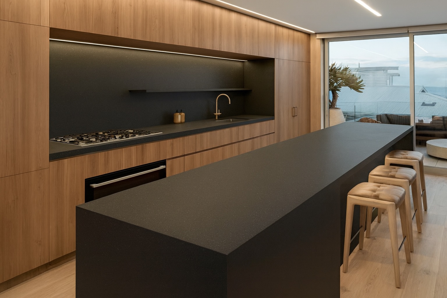 Jet Black Supreme is an elegant natural stone slab that is a simple yet beautiful slab. Originating from India, this black satin granite has a rich dark colour. Its surface is a captivating canvas of black, speckled with subtle and intricate flecks of grey, which further enhance its striking appearance. The Satin finish of Jet Black Supreme grants it a smooth subtle feel, making it a popular choice for elevating the aesthetics of countertops, flooring, or accent features in various interior design projects. Its timeless elegance and remarkable durability render Jet Black Supreme a coveted choice, effortlessly adding a touch of sophistication and grandeur to any space it graces.